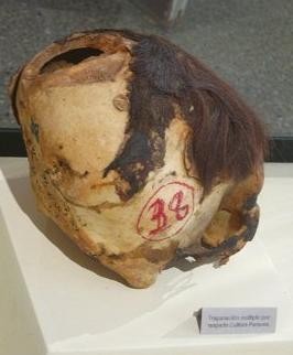 Paracas skull with trepan; it has only a parietal bone, red haired, the thickness of the cranial wall is doble that of the normal human (in all these skulls), it weights 60% higher and the cranial capacity is about 25% superior to ours; DNA tests confirm that this skulls are not human